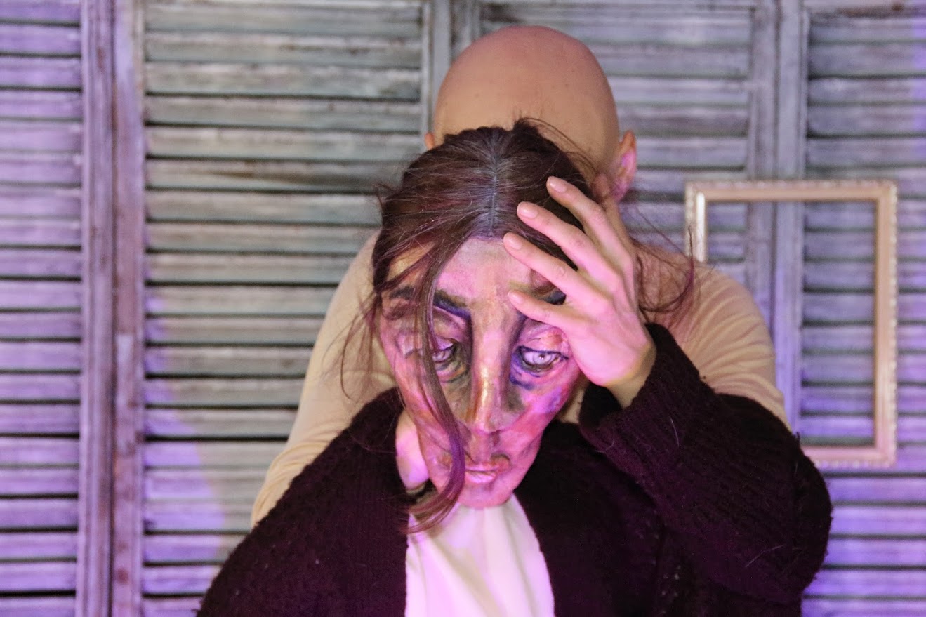 Ella es una mujer en un diálogo constante con esa voz interior. Una lucha constante entre el sí y el no, entre la muerte o la vida. Ella- la marioneta híbrida- en plena lucha con su conciencia- representado por la actriz-.